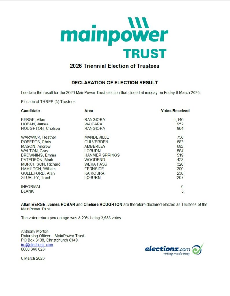 Results for the 2026 MainPower Trust elections were announced late last week, with two new Trust members elected.